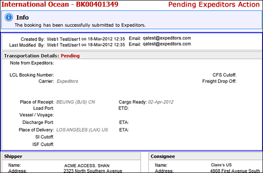Additional Summary Information - Created/Last Modified By & Transportation Details Panel After you submit an ocean booking, the summary page now shows who created the booking and the last time the booking was modified. It also includes a Transportation Details panel that shows your preferred routing details in light gray and italics. Once Expeditors has confirmed booking the shipment, the details will appear in black. Any confirmed routing details which are different from the customer's preference will appear in bolded black. See International Ocean Booking for more information.