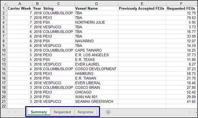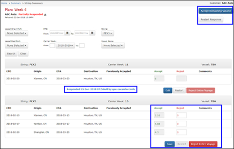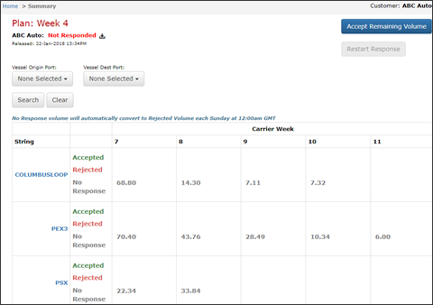 2 A table showing the FEUs allocated per week will be shown. Click any of the String links to view details for that string. You can click Accept Remaining Volume to accept the volume on all Strings in the plan. You can click Restart Response to completely remove and start over on the plan for all Strings.