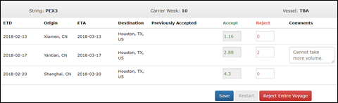 3 The details for that String will appear. You can click Accept Remaining Volume to confirm all the requested FEUs for that string. If you need to restart your responses, you can click Restart Response to remove any responses you have made for the String and start over.